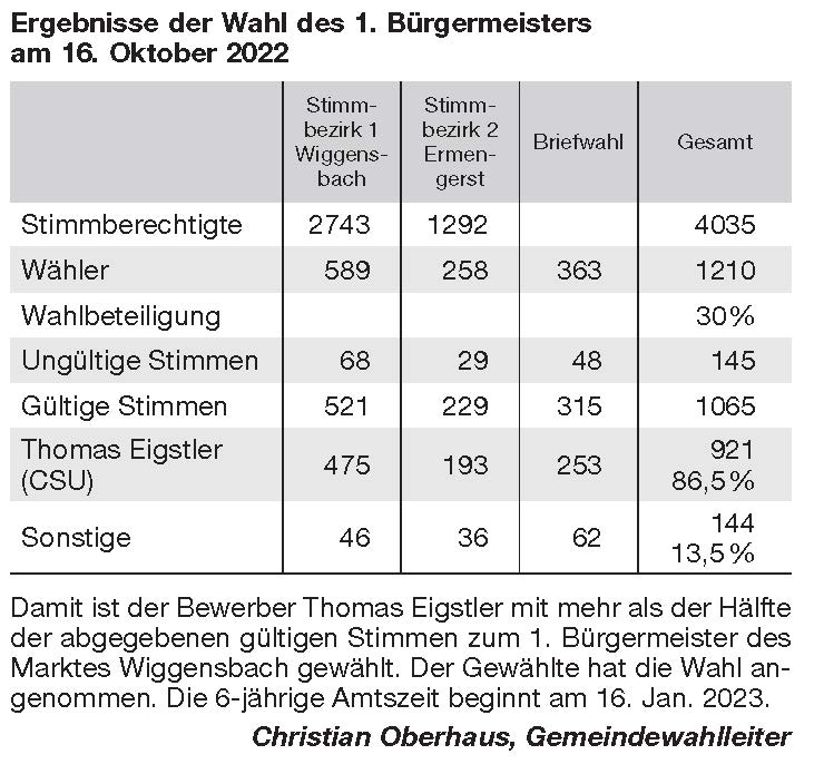 Damit ist der Bewerber Thomas Eigstler mit mehr als der Hälfte der abgegebenen gültigen Stimmen zum 1. Bürgermeister des Marktes Wiggensbach gewählt. Der Gewählte hat die Wahl angenommen. Die 6-jährige Amtszeit beginnt am 16. Januar 2017.